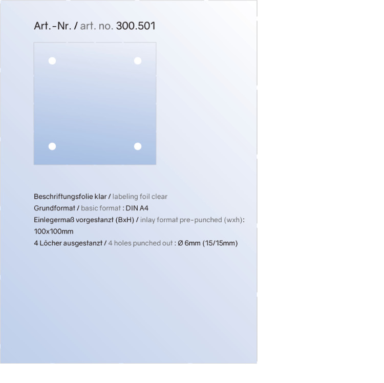 Laserfolien mit Perforation und 4 Bohrungen à 6 mm (klar und mattiert) passend zu Schildhaltern mit 13 mm Kopfdurchmesser der ClassicLine- sowie der UniversalLine-Serie.
