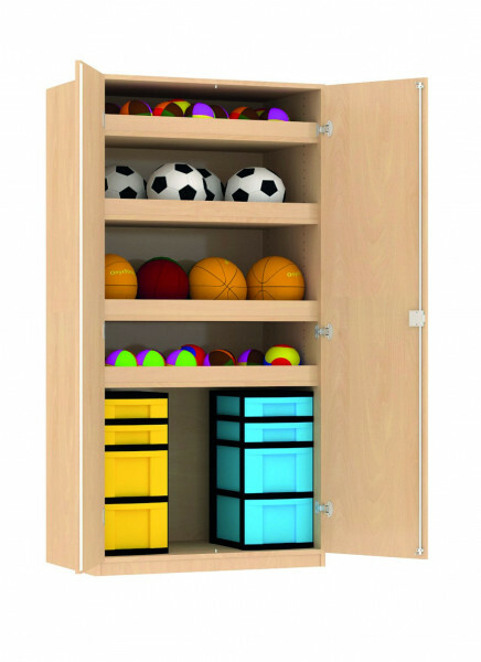 Der Ballschrank hat spezielle Fachböden mit vorderer Aufkantung, die das Herausrollen der Bälle verhindert.