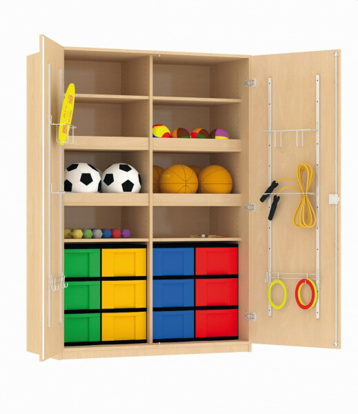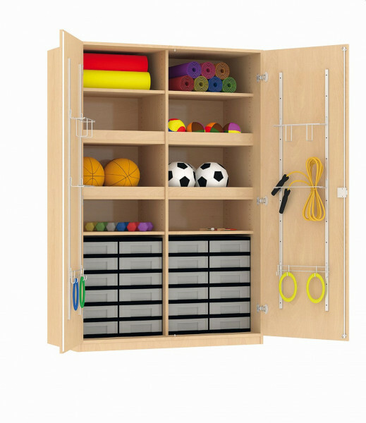 Die Ballschränke sind für sämtliche Sportmedien aus dem Sportunterricht oder Vereinsaktivitäten geeignet, sie sind individuell bestückbar mit Modulen für Reifen, Seile, Keulen, Stangen oder Bällen.