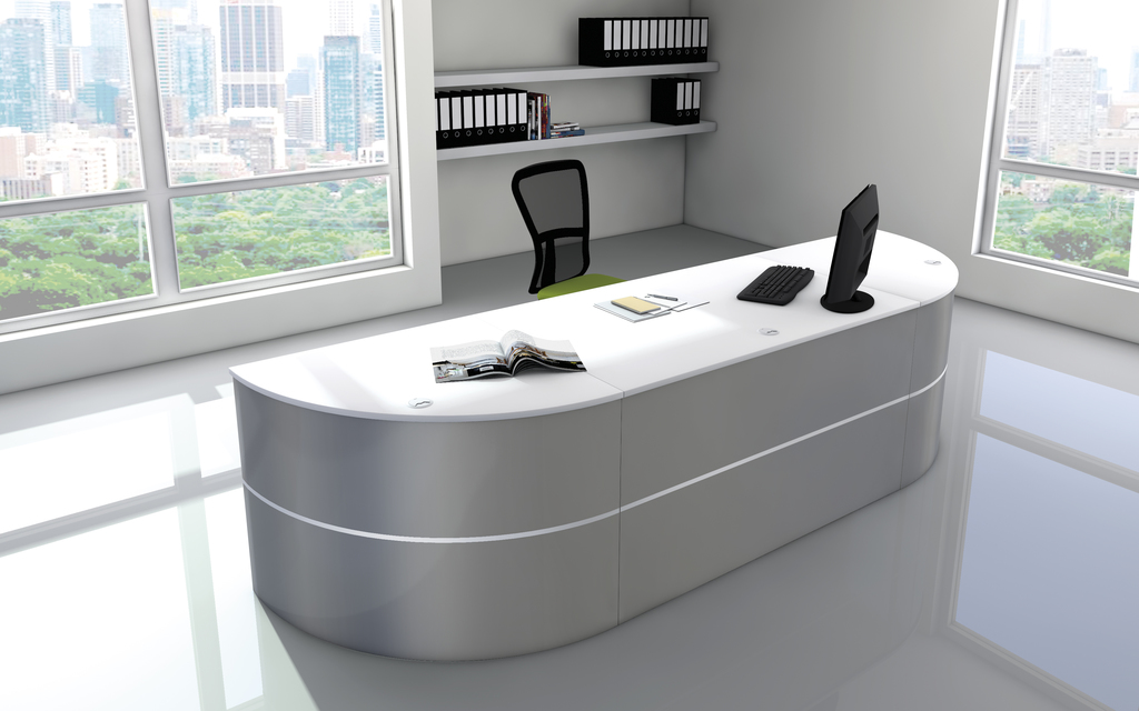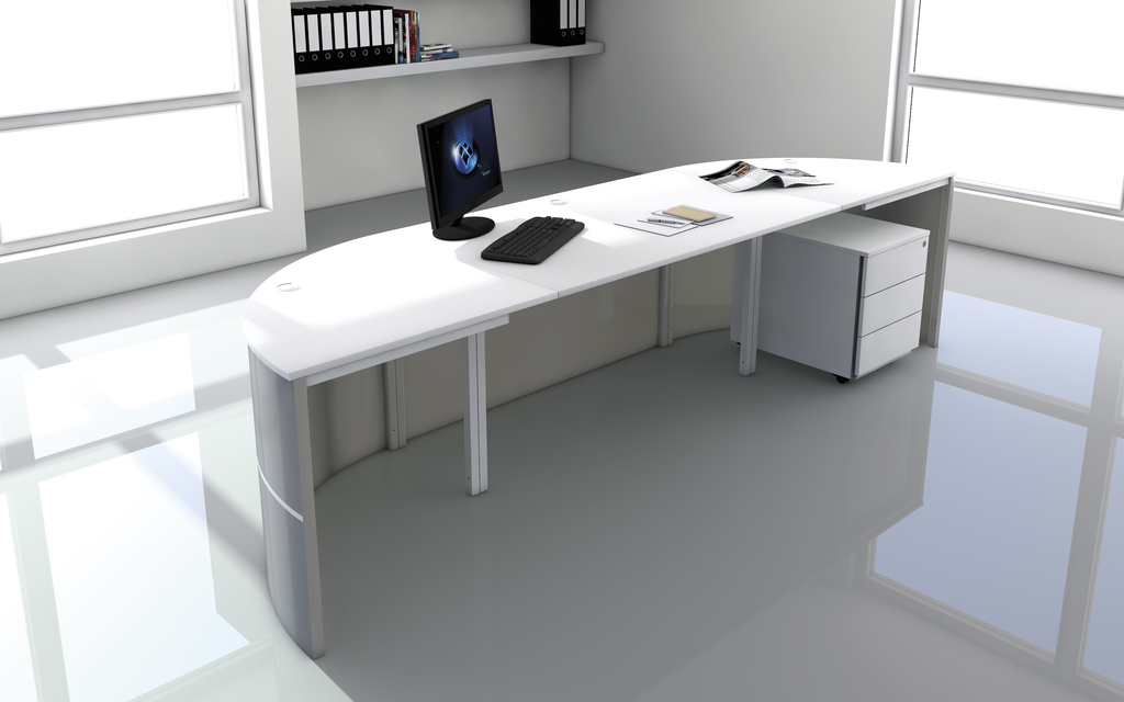 Der Schreibtisch Padua besteht aus einem Tischelement und zwei Eckelementen. Es ist der ideale Tisch, wenn es um direkte Kommunikation, etwa bei Verkaufsgesprächen oder Mitarbeitergesprächen geht. Die solide Holz-/Stahlkonstruktion und die robusten Tischplatten garantieren eine lange Lebensdauer. Die silberfarbene Front ist mit dekorativen weißen Konturstreifen bestückt.