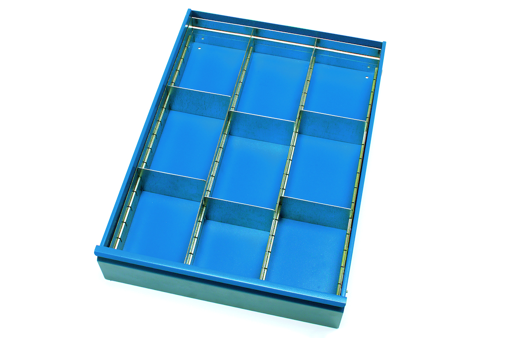 Das Set besteht aus einem Einsatz aus verzinktem Stahlblech mit 2 steckbaren Längsteilern und 6 steckbaren Trennblechen.