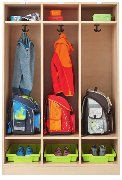 Das praktische Garderobenregal bietet Platz für Schultaschen, Jacken, Schuhe und Vesperdosen, Mützen u.ä. von 3 Schülern