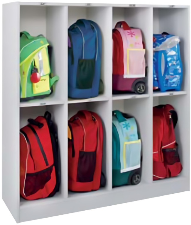 In den Fächern dieser Schultaschenregale lassen sich Schultaschen und andere Gegenstände übersichtlich und ordentlich aufbewahren.