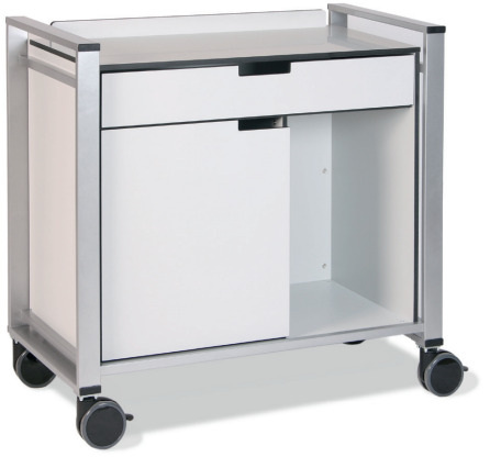 Der Wagen ist auf einem stabilen Edelstahlgestell aufgebaut. Das Gestell ist pulverbeschichtet in Brilliant Silber Feinstruktur. 1 Besteckschublade, 1 Flügeltüre mit Fachboden.