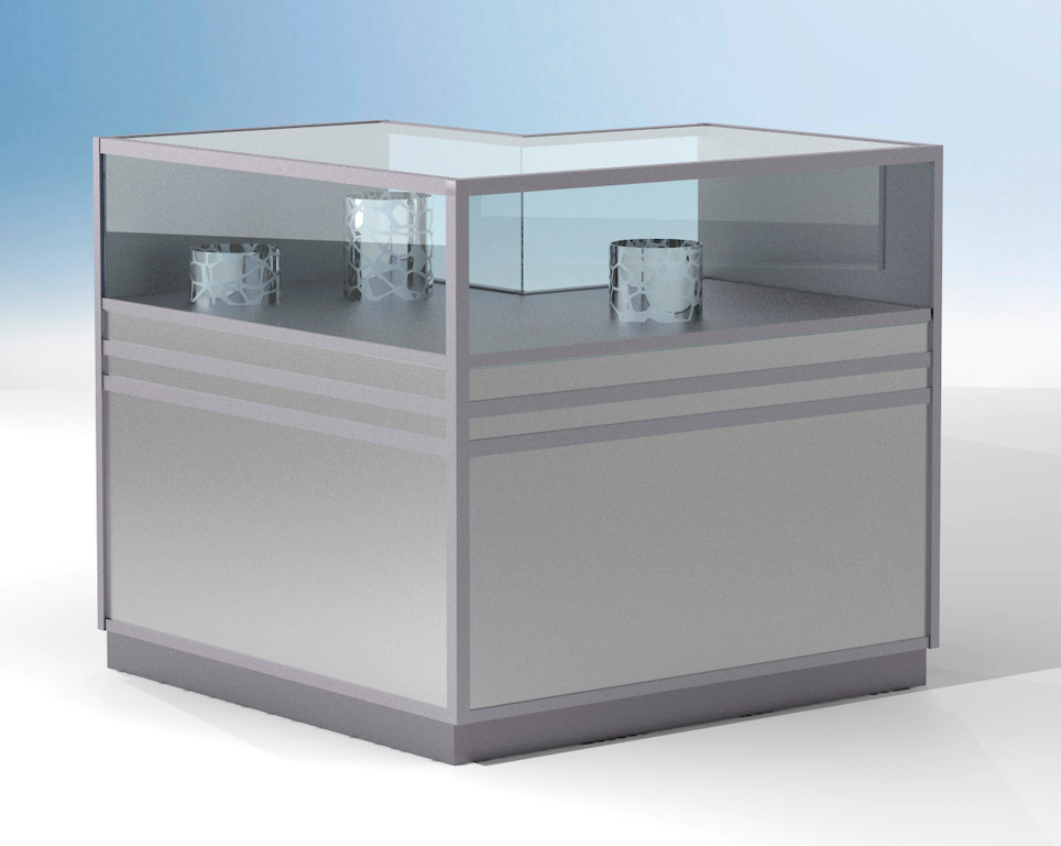 - Thekenmodul Ecke 90°, mit Vollverglasung und frontseitigen Drehtüren aus gehärtetem Einscheiben-Sicherheitsglas DIN1249 / EN12150 und 2 Dickglas-Eckfachböden