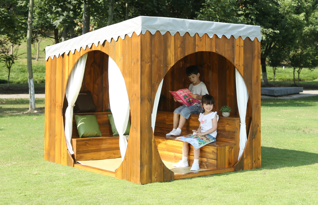 Die stylischen Outdoor-Lounge bietet mehreren Kindern Platz zum gemeinsamen Entspannen oder spielen. Der mitgelieferte Teppich und die Vorhänge tragen zur Gemütlichkeit bei. Das Dach aus wetterfestem Stoff schützt vor Regen und Sonne.
