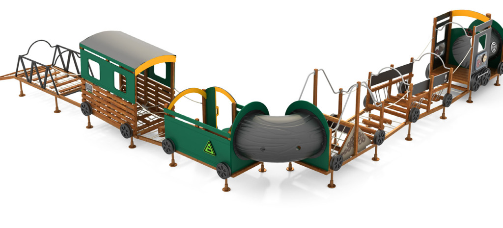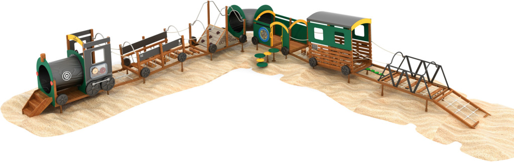 Diese Eisenbahn ist ein Highlight auf jedem Spielplatz. Mit den 12 Elementen entsteht eine Spiel- und Kletterlandschaft, die motorische Fähigkeiten fördert und gleichzeitig den Kindern ein einmaliges Spielerlebnis garantiert. Bei der Auswahl der Materialien wurde besonderer Wert auf lange Haltbarkeit gelegt. Neben anderen hochwertigen Materialien wurde für den Bau vor allem Tali-Holz verwendet - eine Holzart, die erfolgreich eingesetzt wird, wenn es gilt, hohen Belastungen und Witterungseinflüssen zu trotzen. Da die Sicherheit der Kinder an erster Stelle steht, wurden alle Elemente nach DIN EN 1176 entwickelt und gebaut.