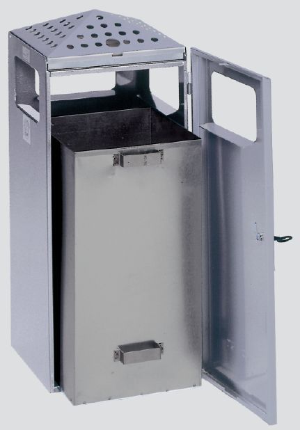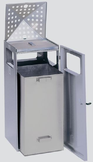 Gefertigt aus verzinkten Stahlblechen, Oberflächenschutz = hochwertige Pulverbeschichtung auf Polyester-Basis, Kopfteil aus verzinktem, gelochtem Stahlblech, aufklappbar. Ascherschale aus verzinktem Stahlblech. Einfaches Entnehmen und Reinigen. Einflügeltür mit Schloss (1 Schlüssel). Lieferung inkl. Inneneinsatz aus verzinktem Stahlblech.