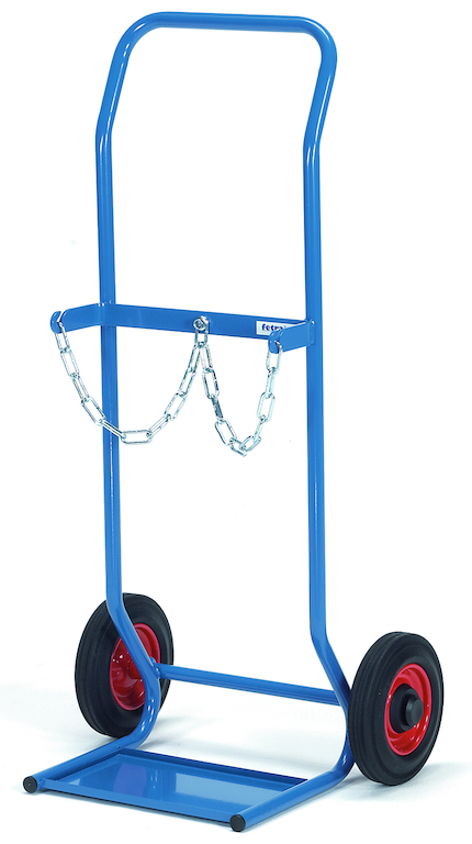 Mit dem Stahlflaschenkarren aus sorgfältig verschweißtem Stahlrohr mit hochwertiger Pulverbeschichtung können 2 Stahlflaschen à 10 Liter Inhalt transportiert werden. Er ist mit einer Stahlblechschaufel mit 3-seitiger Umrandung für sicheren Stand der Stahlflaschen, Flaschenhalterungen mit Kettensicherung und zwei leichtlaufenden Rädern mit Vollgummi- oder pannensicherer PU-Bereifung auf stabilen Stahlfelgen ausgestattet.