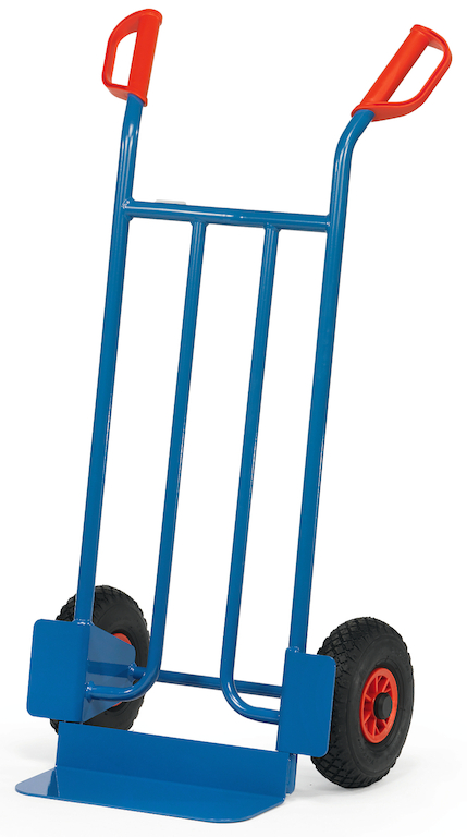 Der handliche, schräg stehende Stahlrohrkarren ist in stabiler Schweißkonstruktion mit hochwertiger Pulverbeschichtung gefertigt. Er ist mit Sicherheitsgriffen, einer anschraub- und austauschbaren Stahlblechschaufel und Rädern auf stabilen Kunststoff-Felgen mit Luft-, Vollgummi- oder pannensicherer PU-Bereifung ausgestattet.