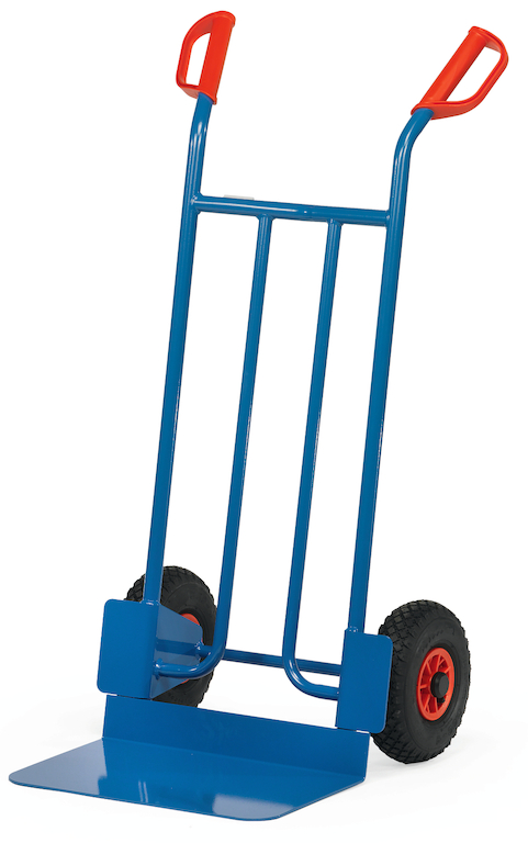 Der handliche, schräg stehende Stahlrohrkarren ist in stabiler Schweißkonstruktion mit hochwertiger Pulverbeschichtung gefertigt. Er ist mit Sicherheitsgriffen, einer anschraub- und austauschbaren Stahlblechschaufel und Rädern auf stabilen Kunststoff-Felgen mit Luft-, Vollgummi- oder pannensicherer PU-Bereifung ausgestattet.