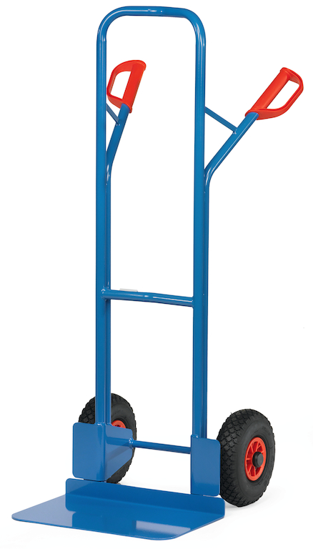 Der handliche, gerade stehende Stahlrohrkarren ist in stabiler Schweißkonstruktion mit hochwertiger Pulverbeschichtung gefertigt. Er ist mit Sicherheitsgriffen, einer anschraub- und austauschbaren Stahlblechschaufel und Rädern auf stabilen Kunststoff-Felgen mit Luft-, Vollgummi- oder PU-Bereifung ausgestattet. Die Querstreben und der Bügel sind für den sicheren Transport von runden Gütern wie Rollen, Kannen Eimern u.ä. durchgebogen.