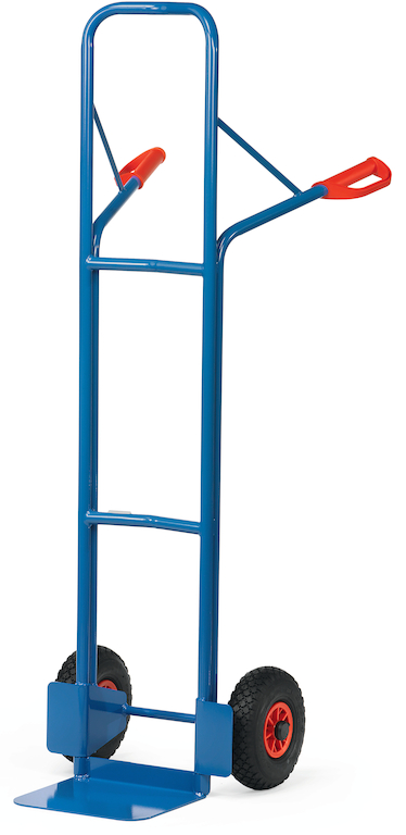 Der handliche, gerade stehende Stahlrohrkarren ist in stabiler Schweißkonstruktion mit hochwertiger Pulverbeschichtung gefertigt. Er ist mit Sicherheitsgriffen, einer anschraub- und austauschbaren Stahlblechschaufel und Rädern auf stabilen Kunststoff-Felgen mit Luft-, Vollgummi- oder Polyurethanbereifung ausgestattet. Die Querstreben und der Bügel sind für den sicheren Transport von runden Gütern wie Rollen, Kannen Eimern u.ä. durchgebogen.