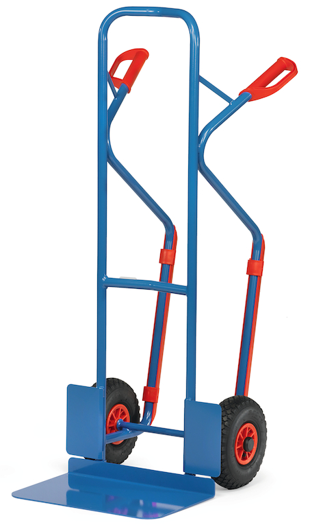 Der handliche, gerade stehende Stahlrohrkarren ist in stabiler Schweißkonstruktion mit hochwertiger Pulverbeschichtung gefertigt. Er ist mit Sicherheitsgriffen und Kunststoff-Gleitkufen, einer anschraub- und austauschbaren Stahlblechschaufel und Rädern auf stabilen Kunststoff-Felgen mit Luft-, Vollgummmi- oder PU-Bereifung ausgestattet. Die Querstreben und der Bügel sind für den sicheren Transport von runden Gütern wie Rollen, Kannen Eimern u.ä. durchgebogen.