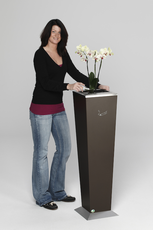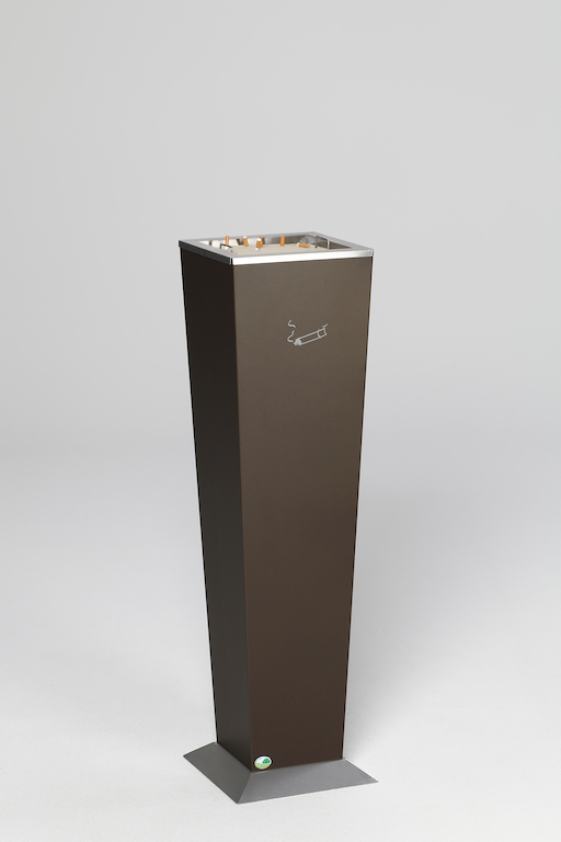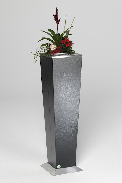 Dekorative Aschersäule in Pyramidenstumpfform. Gefertigt aus verzinktem Stahlblech mit einer Struktur-Pulverbeschichtung (Fußteil aus Edelstahl, geschliffen).