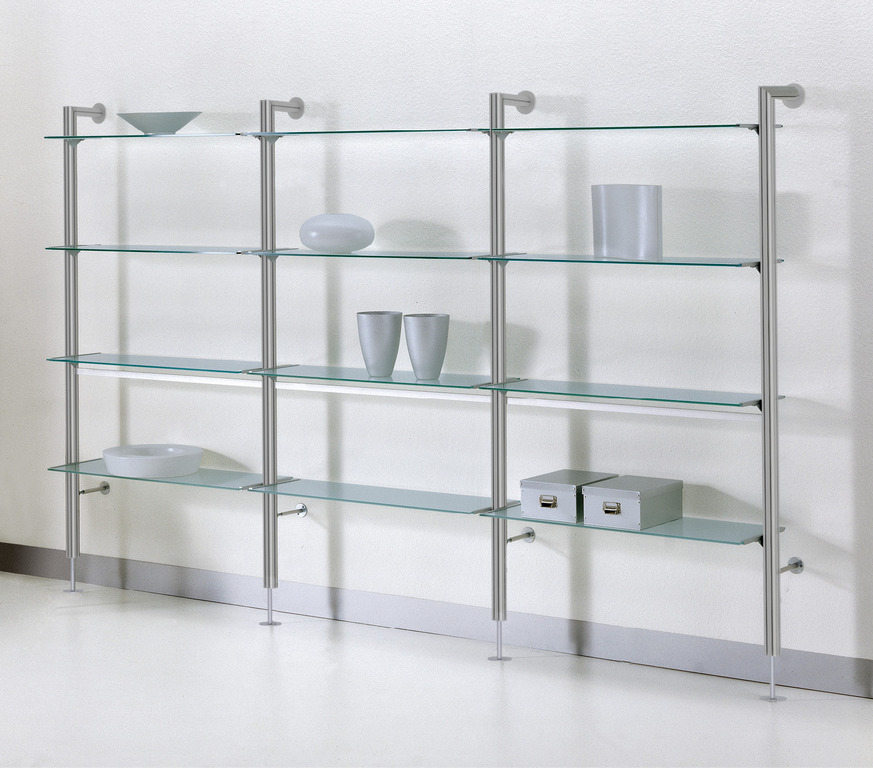 Das Regalsystem von CORST, das zur Wandmontage vorgesehen ist, ist 302,8cm breit und 21cm tief. Das komplette Regalsystem besteht aus einem Grundmodul mit 3, 4 oder 5 Fachböden, das mit 2 Anbaumodulen inkl. 8 Fachböden erweitert ist. Dank der verdeckten Exzenter-Verbindungen ist der Aufbau unkompliziert. Die hochwertig eloxierte Aluminiumstruktur überzeugt durch ihre Langlebigkeit. Die 4 Stück Regalständer sind mit Stellfüßen versehen, die nivellierbar sind.