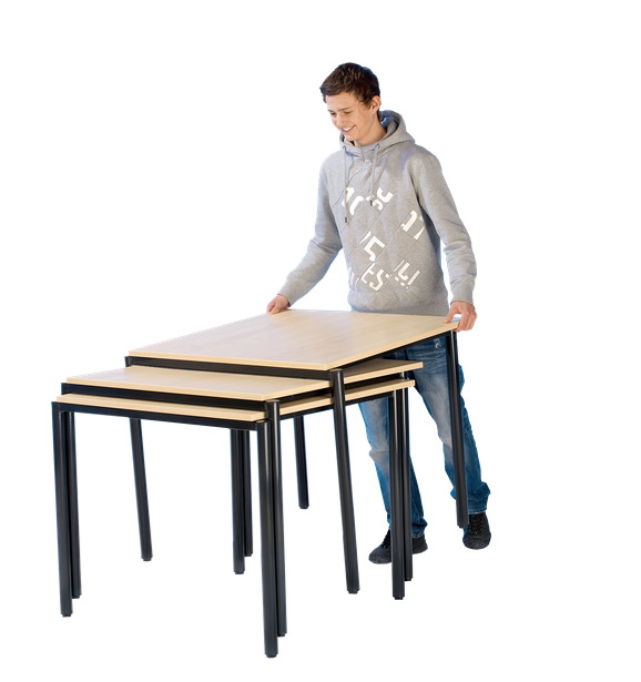 Die Tische können durch die besondere Konstruktion des Tischgestelles platzsparend gestapelt und auch nahtlos an allen Tischkanten aneinander gestellt werden.