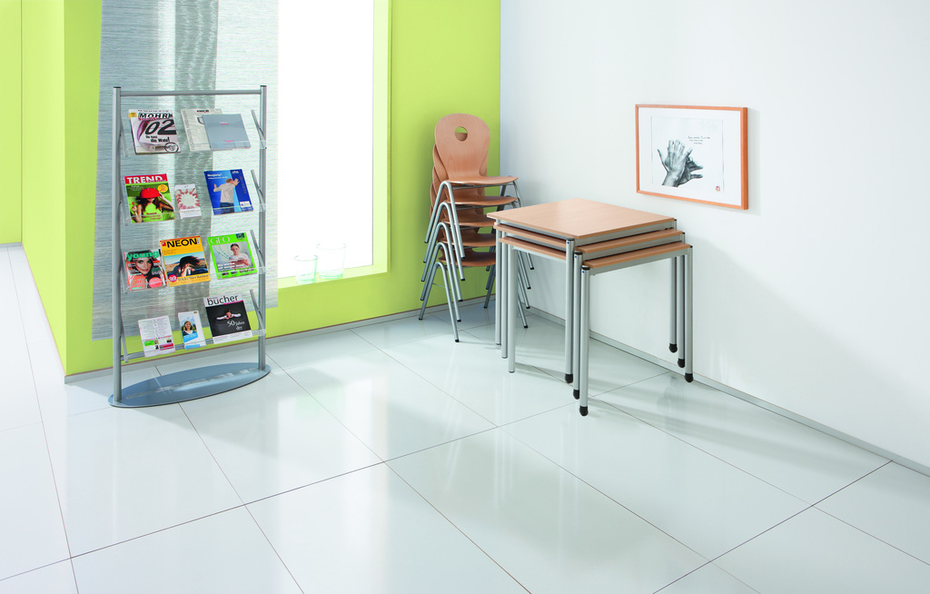 Der Stapeltisch modo ist durch das Aluminiumgestell leicht und gleichzeitig sehr stabil. Die Tische lassen sich Dank der Rollen leicht verschieben. Bis zu 5 Tische können platzsparend übereinander gestapelt werden.