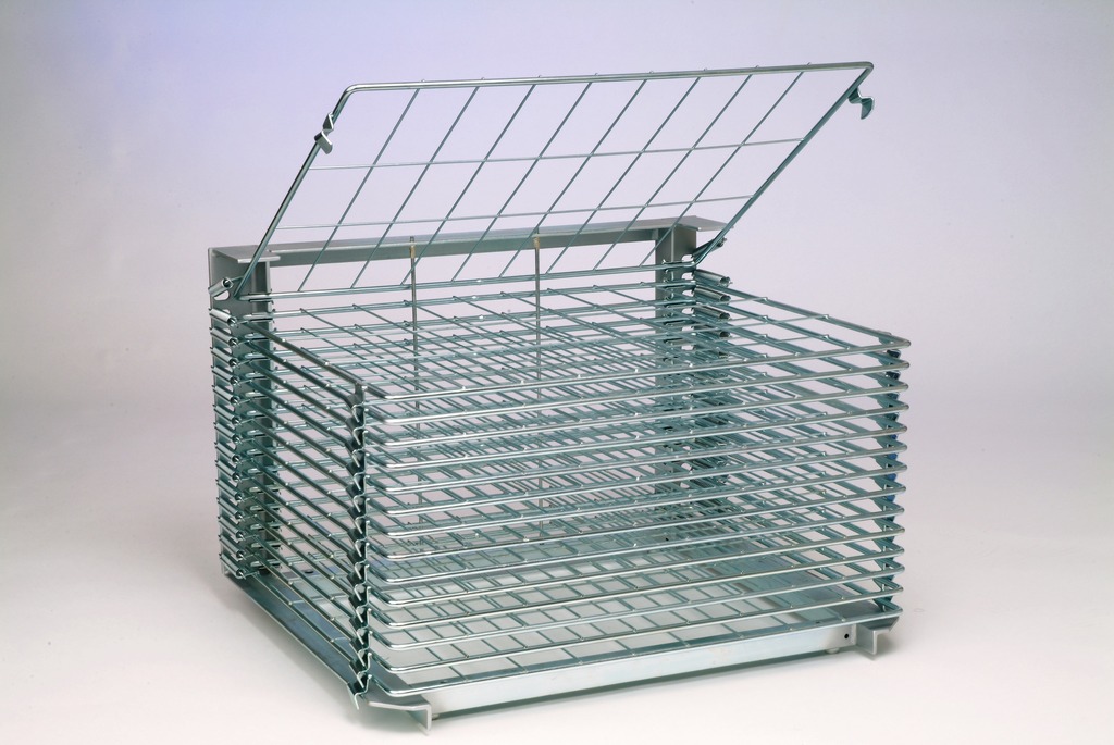 Der DWORSCHAK-Tischstapeltrockner wird mit 15 Horden, 25 mm Abstand hergestellt. Die eingeschweißten Gitter bestehen aus runden 3 mm starken Querstäben im Abstand von 75 mm, die 3 mm starken Längsstäbe im Abstand von 170 mm ergeben die hohe Stabilität der Stapeltrockner. Dadurch wird ein hakelfreies Einlegen und Gleiten des Druckgutes gewährleistet.