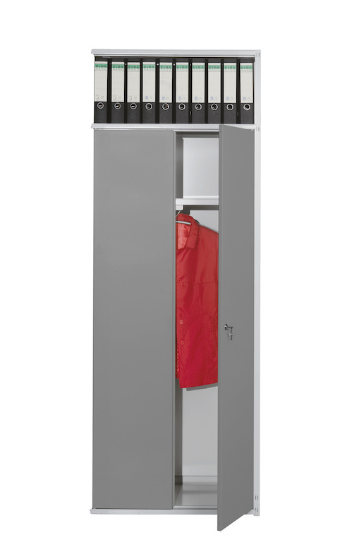 - Hutablage aus Stahlblech, pulverbeschichtet, Farbe Lichtgrau RAL 7035.