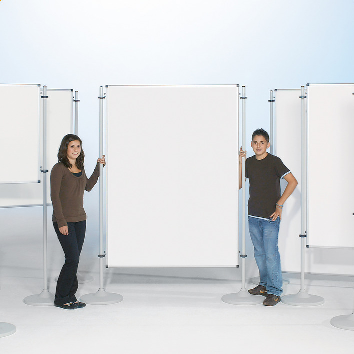 Unsere Moderationswand kann einfach in die Stative gehängt werden, fertig! Beliebig kombinierbar, kinderleicht auf- und abzubauen, quer- und längsförmig verwendbar. Eignet sich ideal als Beistelltafel im Klassenraum, z.B. für Projekte in der Schule.