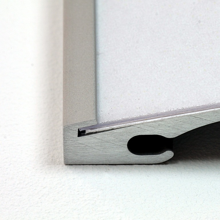 Das Türschild Kassel bestehend aus gewölbten Aluminumstrangpressprofil (silber eloxiert) mit geradem Seitenabschluss. In das Profil werden die Arcylabdeckung, darunter der Beschriftungsträger und der Einlegekarton durch leichtes Biegen in das Profil eingelassen. Die Montage erfolgt mittels der Schnellmontageplatte die mit Schrauben und Dübeln an der Wand befestigt wird.