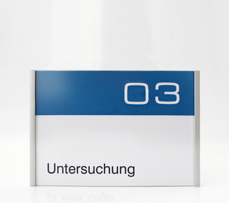 Das Türschild München besteht aus einem gezogenen, silber eloxierten Aluminiumprofil. In dieses wird eine transparente Antireflex-Acrylglasabdeckung eingeschoben, unter die der Beschriftungsträger eingelegt wird.