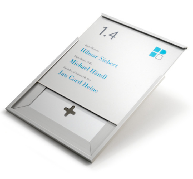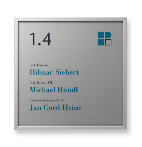 Sehr modern und filigran wirkt das Türschild FL mit seinem schmalen Aluminiumrahmen. Die raffinierte Schubladentechnik ermöglicht einen werkzeuglosen Austausch der Beschriftungsfolie in Sekundenschnelle, ohne dass das Schild von der Wand genommen zu werden braucht. Durch die Individualität der Beschriftung, die wir auch gerne nach Ihren Angaben vornehmen, können firmeneigene Logos, Farben oder Grafiken in die Gestaltung einfließen.