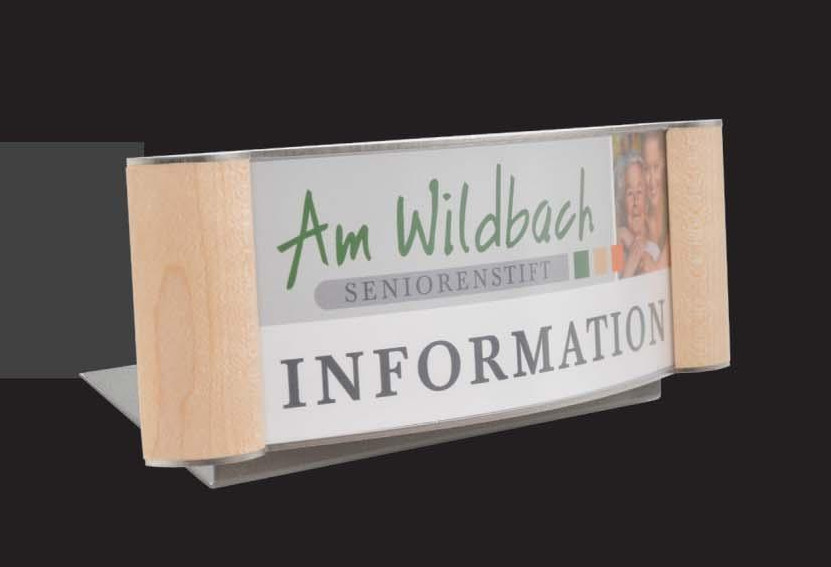 Grundplatte mit runden, 2,7 mm breiten Seitenprofilen aus Echtholz. Oben und unten mit 2 mm gelaserten Edelstahlabschlüssen. Beschriftungsträger aus weißem Karton 160 mm/m². Transparente Schutzabdeckung aus Polycarbonat.