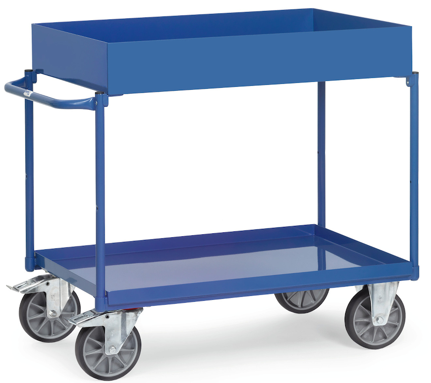 Der sorgfältig verarbeitete Tischwagen aus geschweißter Stahlkonstruktion mit hochwertiger Pulverbeschichtung ist besonders für gereinigte oder ölige Teile geeignet, da nichts auf den Boden tropft. Die beiden öldicht geschweißten Stahlblechwannen mit 40 mm bzw. 150 mm hohem Rand sind mit den Stahlrohrbügeln verschraubt. Die Tragkraft beträgt bis zu 400 kg. Der Schiebegriff ist waagrecht stehend. Als Zubehör ist ein Scannerhalter erhältlich.