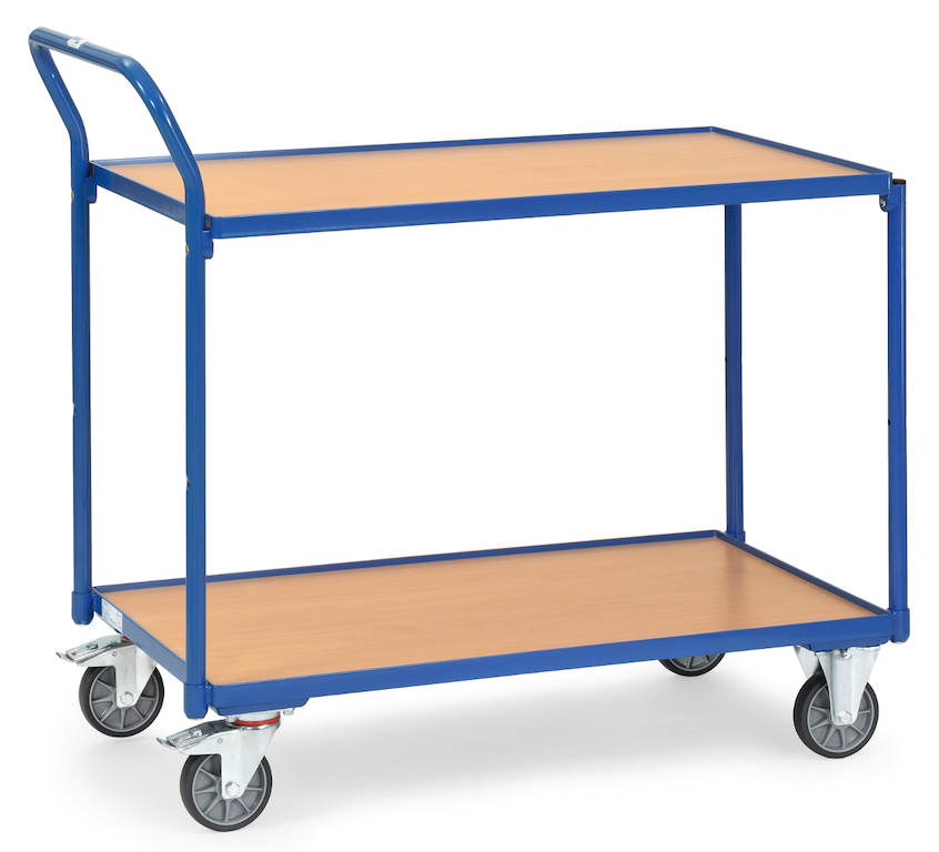 Stahlrohr und Profilstahl geschweißt, pulverbeschichtet in blau ( RAL 5007), dauerhaft oberflächengeschützt, schlag- und kratzfest. Geschweißte Schraubkonstruktion, Baukastensystem. Plattform, mittlere und obere Ladefläche: im Profilrahmen liegende Platten aus Holzwerkstoff, Oberfläche Buchendekor. Schiebegriff hoch stehend.