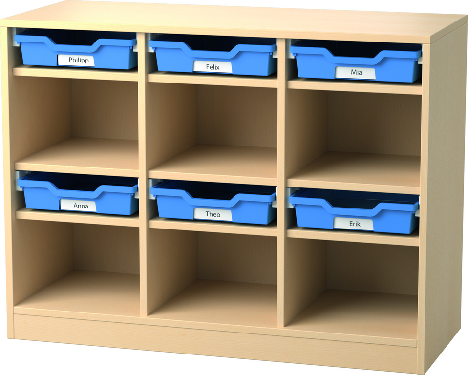 Pro Abteil: 2 Schienenpaare zum Einschieben von Materialboxen (bitte separat bestellen), 1 fester Boden und 2 Einlegeböden (ergibt 2 offene Fächer)