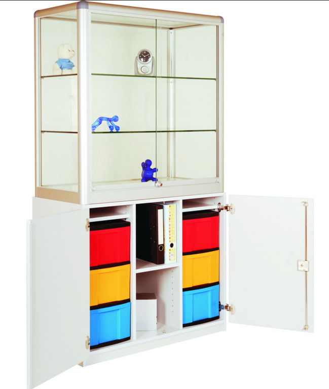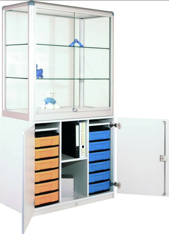 Unsere Ausstellungsvitrine ist die perfekte Lösung, um Ihre wertvollen Gegenstände stilvoll zu präsentieren und sicher aufzubewahren. Sie verfügt über zwei abschließbare Glas-Schiebetüren, die einen klaren Blick auf den Inhalt ermöglichen. Mit zwei Glas Einlegeböden bietet sie ausreichend Platz für die Präsentation Ihrer Exponate. Der Unterschrank darunter verfügt über zwei abschließbare Türen mit einem frontbündigen Zylinderschloss für zusätzliche Sicherheit. In der Mitte befinden sich zwei Trennwände und ein Fachboden, während auf der linken und rechten Seite je eine Modulbox mit sechs flachen Schubladen für eine geordnete Aufbewahrung sorgt.