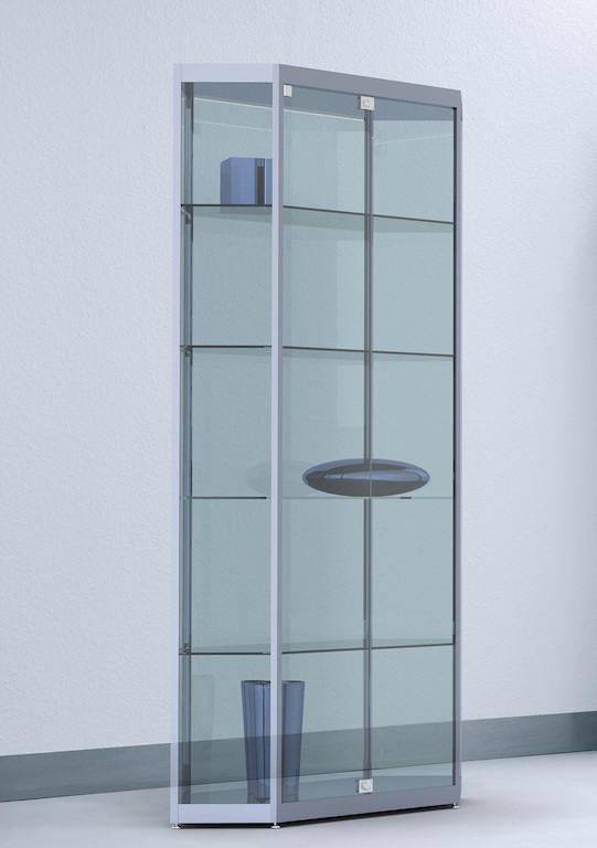 silber eloxiert. Gegen Mehrpreis auch verchromt, im Edelstahlfinish oder RAL-farbbeschichtet erhältlich - Mit 4 höhenverstellbaren Dickglasböden auf Metallfachbodenträgern - auf Wunsch auch durch weitere Böden ergänzbar