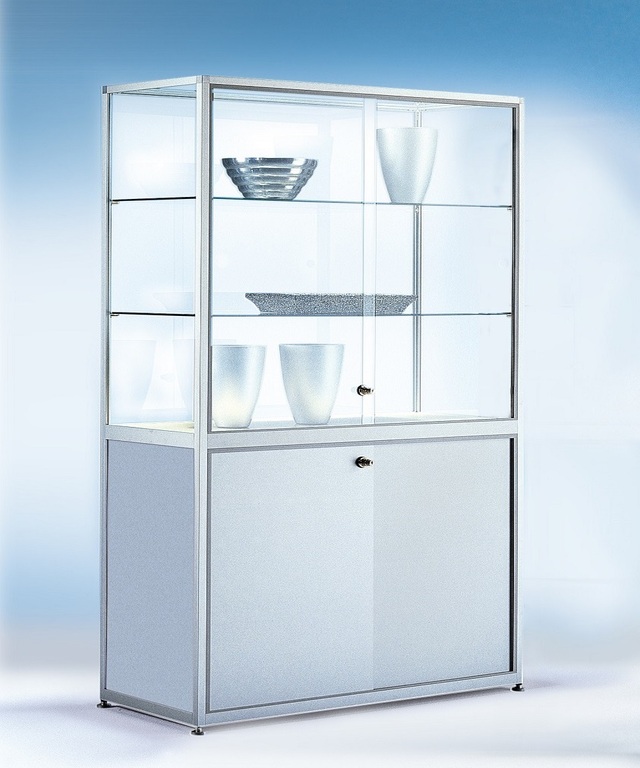 - Vitrine und Unterschrank mit frontseitigen Schiebetüren in stabilen Beschlägen und Metallanschlag, Druckzylinderschloss mit 2x Schlüssel