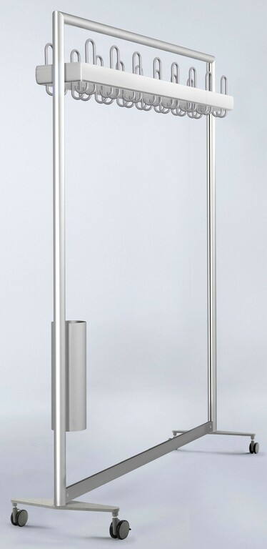 Reihengarderobe in Aluminiumstruktur, Rahmenprofil Ø 40 u. 16 mm silber eloxiert, formschöne Gehrungsverbindung, Aluminium- hakenkrone mit 16 Dreifachhaken silber metallic, feststehend oder mobile vormontierte Ausführung Format: 1660x1680x450 (BxHxT)