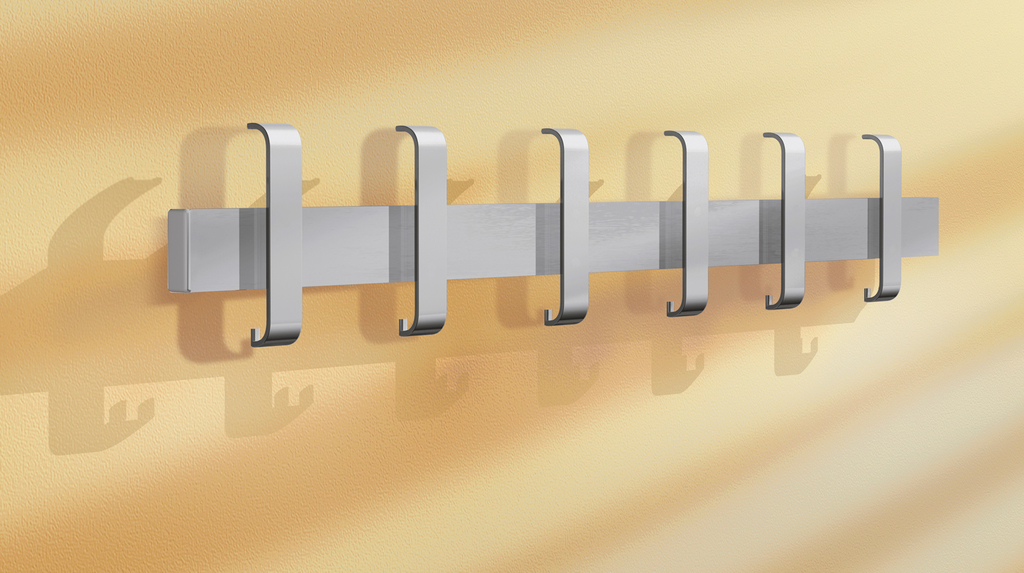 | 190 x 950 x 80 mm | 6 Huthaken, 6 doppelte Mantelhaken | Alusilber | 2,1 kg |