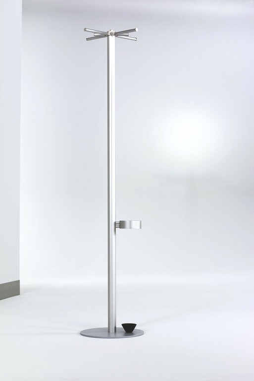 Aluminiumgarderobe mit Rundprofil Ø 45 mm silber eloxiert, Hakenkrone in Vollaluminium eloxiert, 8 Garderobenträger, Edelstahlverbindungen, Metallbodenplatte Stahl Ø 350x8 mm in RAL 9006 silber, vormontierte Ausführung H = 1700, Ø 350