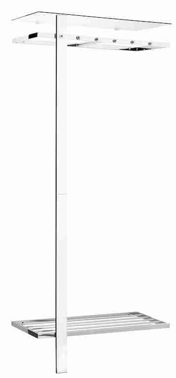 Wandgarderobe verchromt in edler, zeitloser schlichter Optik mit Hutablage aus Glas, Stange für Kleiderbügel und 6 Haken für Garderobe und Taschen sowie eine Schuhablage.