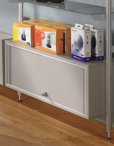 Das Regalsystem LINK passt perfekt zur Vitrinenserie LINK. Das Staufachschrankmodul lässt sich sowohl in das Grundregal als auch in das Anbauregal der wandmontierten und freistehenden Regalmodule integrieren.