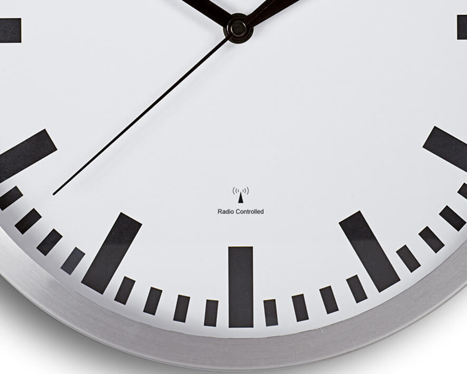 - Ziffernblatt in weiß mit Minuten- und Stundeneinheiten.