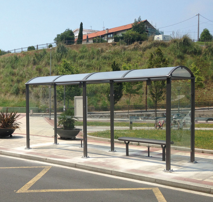 Eine hochwertige Buswartehalle mit schlichtem Design, die sich harmonisch in ländliche und städtische Umgebungen einfügt.