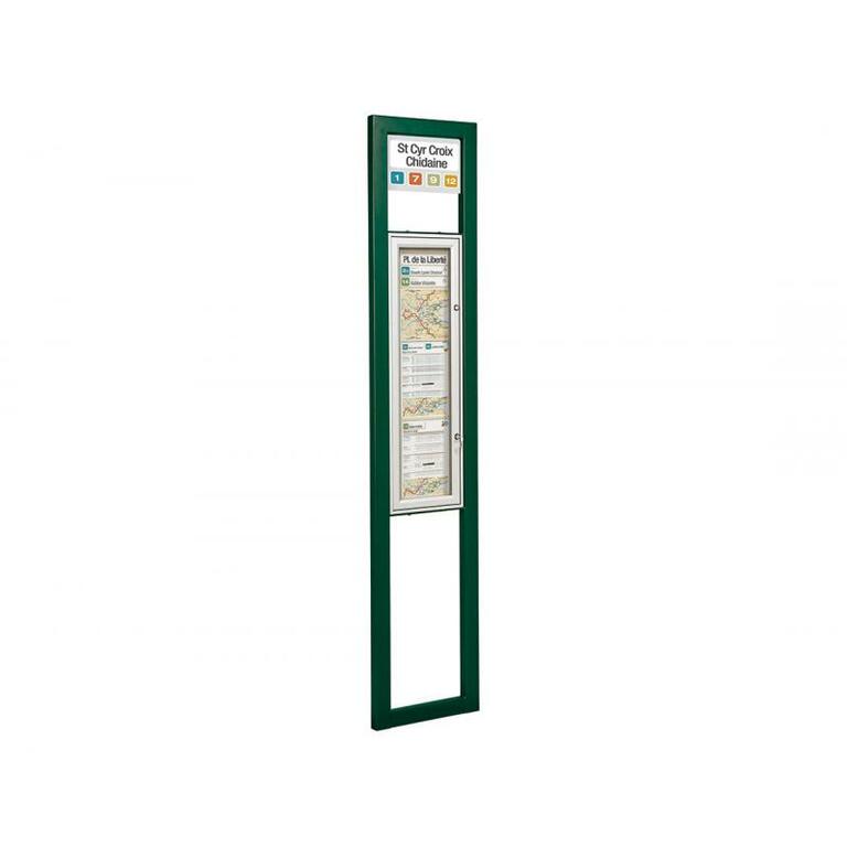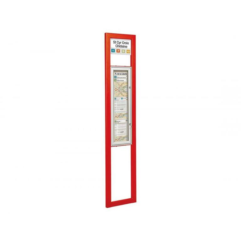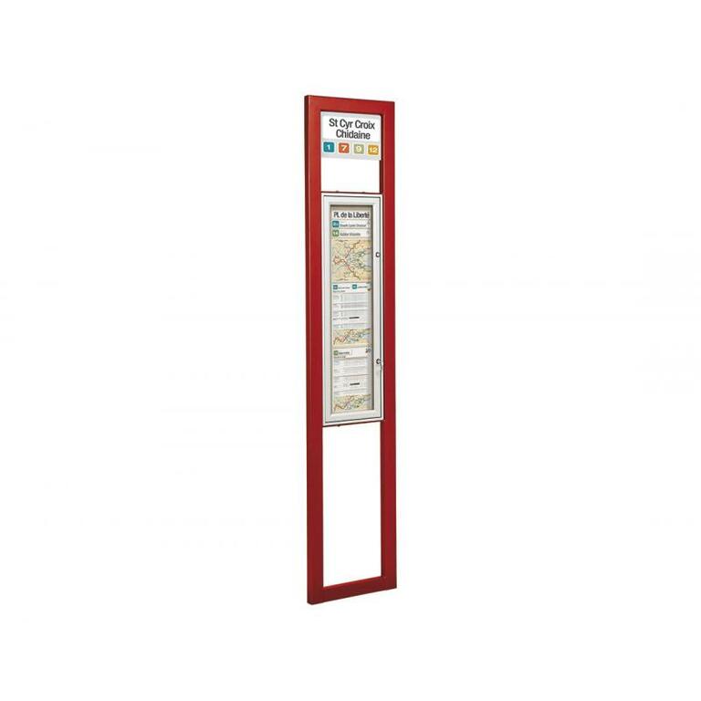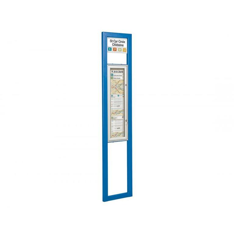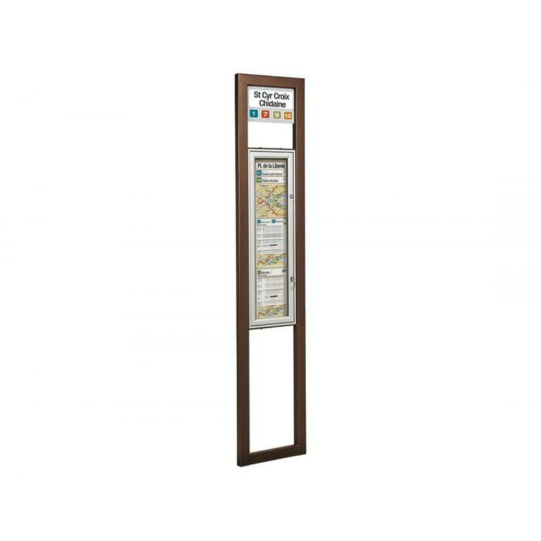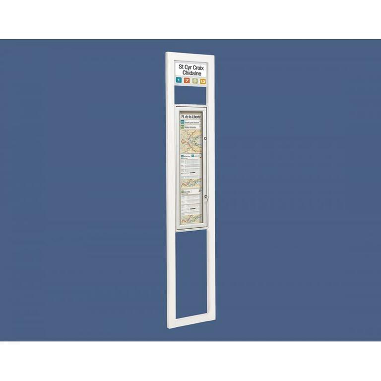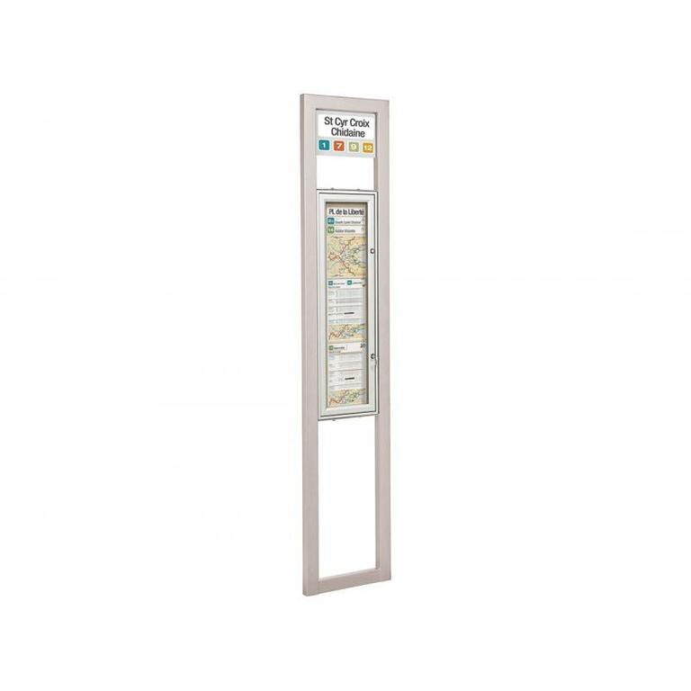 - Ein- oder doppelseitiger Schaukasten: Rahmen aus eloxiertem Aluminium, 30 oder 75 mm dick, zwei Schlösser, Plexichocs ® - Verglasung, 4 mm stark, Höhe 900 x Breite 215 mm (Plakatfläche).
