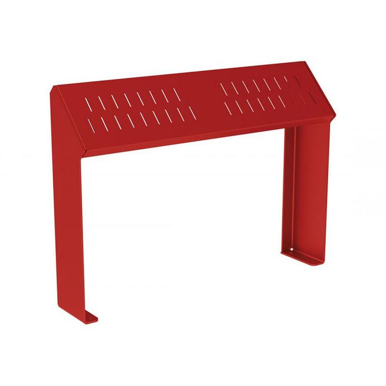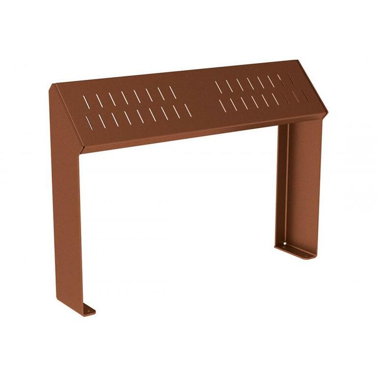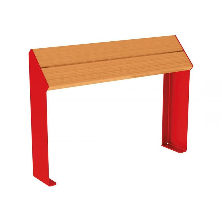 Die Standlehne zeichnet sich durch ihre zeitgenössische Linienführung aus und bietet eine Auswahl an Materialien: Sie ist entweder komplett aus Stahl gefertigt oder kombiniert Stahl und Holz. Die Struktur besteht aus verzinktem Stahl, beschichtet in verschiedenen RAL-Farben. Die Sitzfläche kann wahlweise aus Stahl oder Holz sein. Die Montage erfolgt auf Bodenplatten.