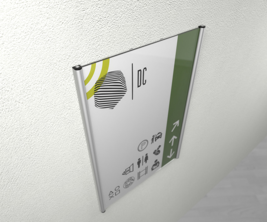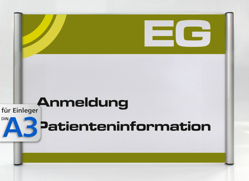 Aluminiumstrangepressprofil mit seitlichen Rundelementen, Antireflexabdeckung. Schnellmontageplatte, computerbeschriftbar, Textzeilen frei wählbar. Mit Abdeckkappen.