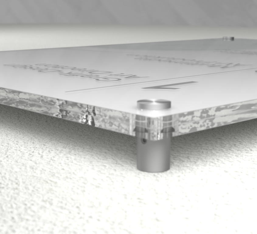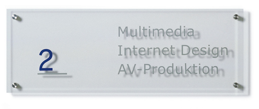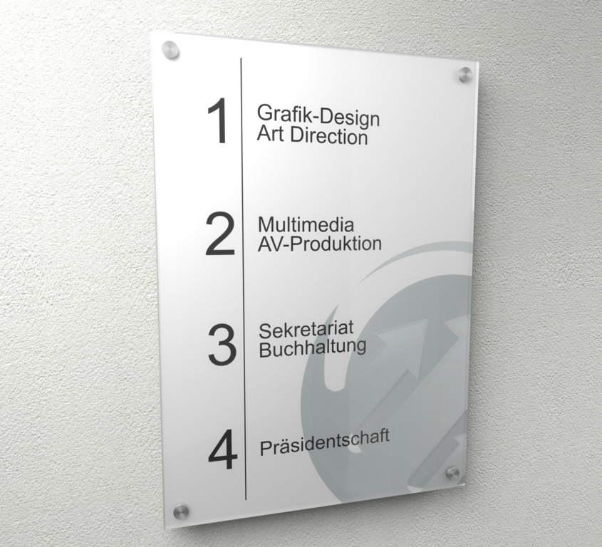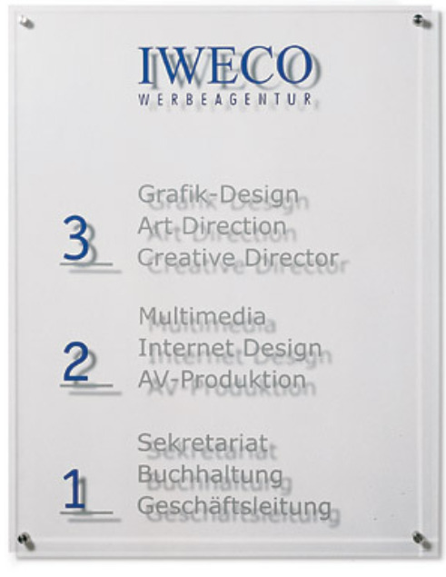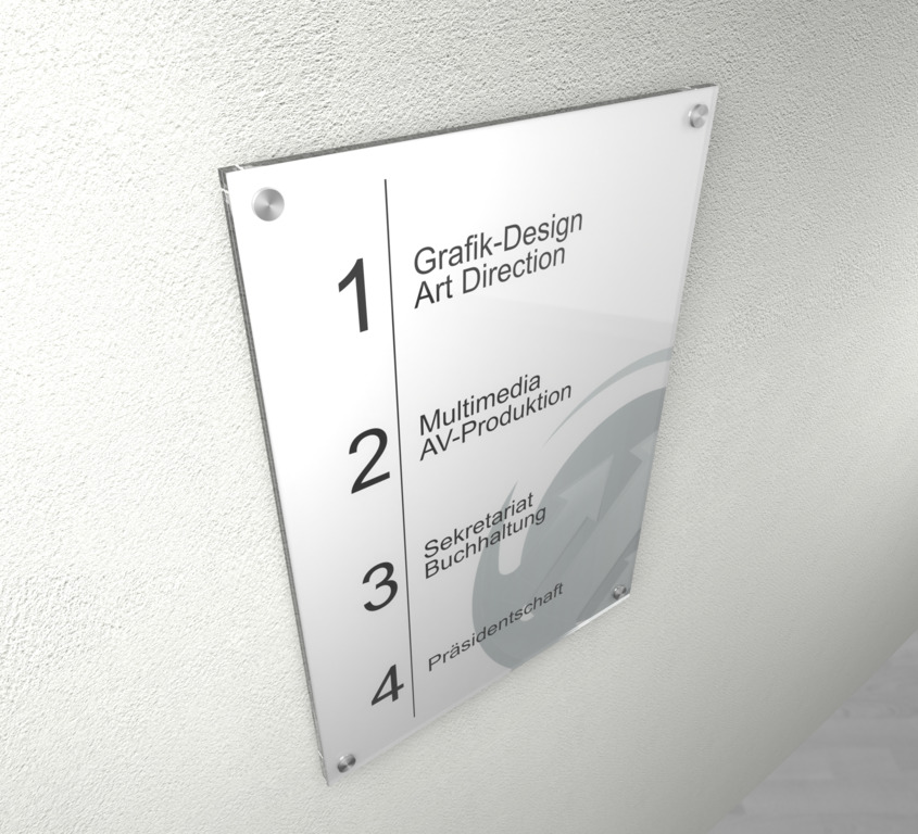 Der Wegweiser K aus hochtransparentem Acrylglas (bei Verwendung im Innenbereich mit zwei 5 mm starken Acrylglasplatten, für den Außenbereich mit einer 10 mm starken Acrylglasplatte) und Halterungen aus gebürstetem Edelstahl ist die transparente Alternative für Ihr Objekt. Die Beschriftung, die wir gerne nach Ihren Angaben vornehmen, erfolgt im Folienschnitt oder mit Digitaldruck-Technik. Die Hochleistungsfolie für die Beschriftung ist in den meisten RAL-Farben erhältlich.