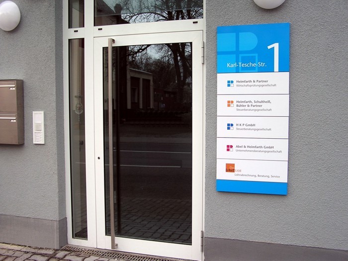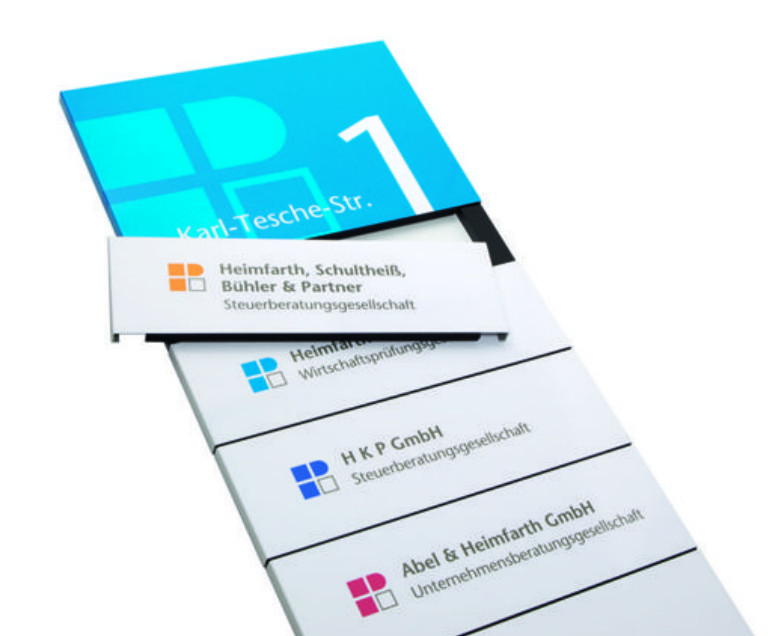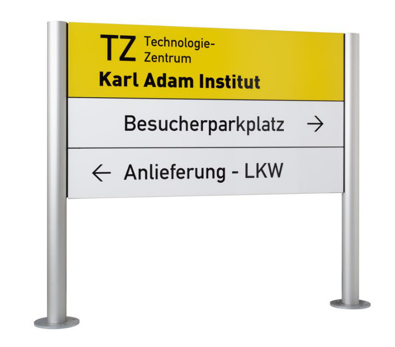 Eine einheitliche und harmonische Gesamtbeschilderung wird in Kombination mit dem Hängeschild S, Fahnenschild S und Pylon S, der fest montiert oder mobil aufgestellt werden kann, erzielt.