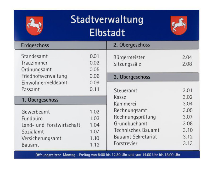 - Die minimale Breite der Elemente beträgt 400 mm, die maximale Breite 1800 mm. Die minimale Höhe beträgt 200 mm. Die Gesamthöhe des Wegweisers sollte 3000 mm nicht übersteigen.