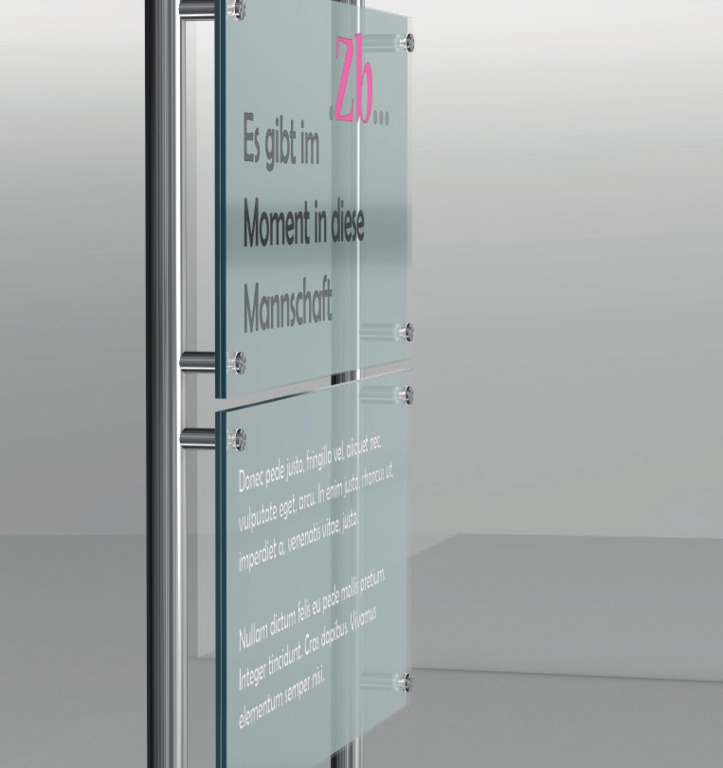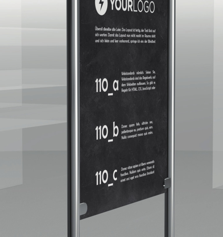Ein Schild umfasst jeweils das Schildmaterial inkl. Bohrungen, 4 bzw. 6 Schildklemmen/Schildhalter inkl. Schrauben zur Befestigung am Rundrohr und die notwendigen Gewindebohrungen in den Rundrohren. Diese werden standardmäßig so ausgeführt, dass