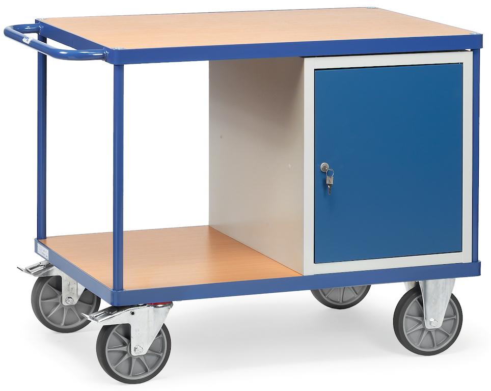 Der stabile Werkstattwagen ist im Baukastensystem in sauber verarbeiteter Profilstahl-/Stahlrohrkonstruktion mit hochwertiger Pulverbeschichtung gefertigt. Die Plattform und die Arbeitsplatte bestehen aus im Profilrahmen liegenden Holzwerkstoffplatten mit Oberfläche in Buchendekor. Der Schiebegriff ist aus Stahlrohr. Der abschließbare Flügeltürenschrank aus pulverbeschichtetem Stahl ist erstklassig verarbeitet und bietet Stauraum für Werkzeug und ähnliches.